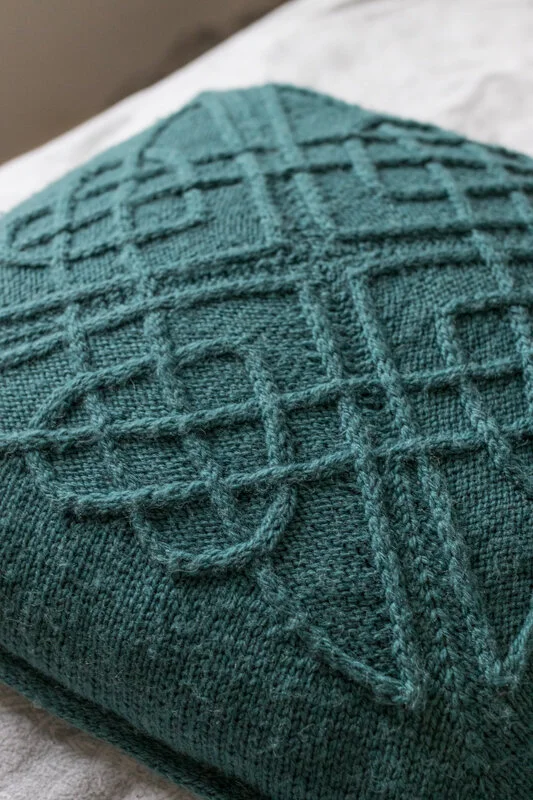 This cushion cover is worked in three pieces. First the cabled front panel is worked, in the round and from the centre out. The stitches of the front panel are cast off with an i-cord edging; then the envelope-style back panels are worked flat, by picking up sts along the i-cord edging. Finally, after blocking, the back panels are seamed at the edges of the cushion, and buttons are added to allow for easy insertion and removal of the inner cushion.