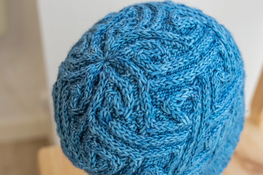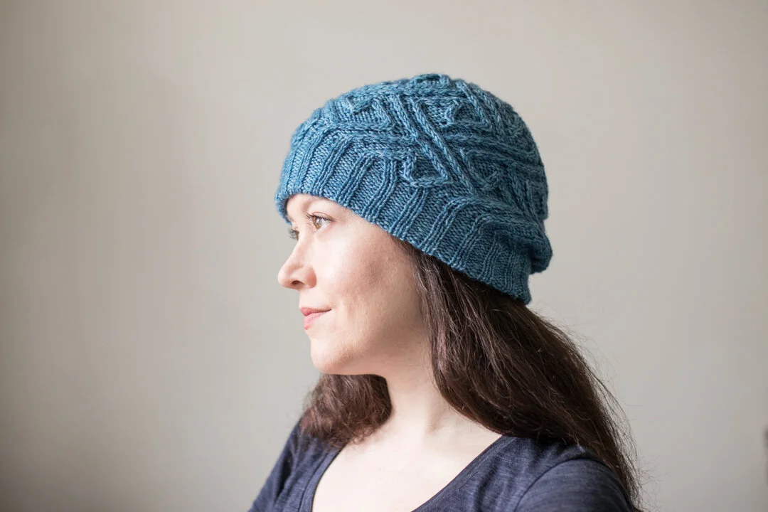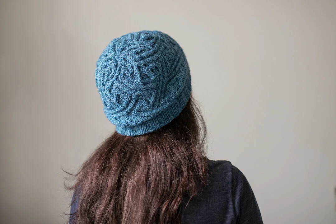 This hat features an all-over cable pattern inspired by the key patterns (angular spirals) commonly found in Pictish art.